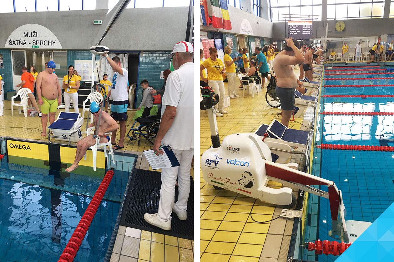 Vážime si, že sme sa mohli spolupodieľať na plynulom priebehu tejto významnej športovej udalosti. Ako vidíte na priložených fotografiách, po technickej stránke sme ho zabezpečili dvomi zariadeniami, ktoré sme používali pri pomoci s presunom súťažiacich z a do bazéna: špeciálnym pojazdným bazénovým zdvihákom - pre bezpečné a rýchle vkladanie a vyťahovanie plavca z bazéna a zariadením na báze stropného zdviháka – model Ergolet, ktorým sa dajú pohodlne, dôstojne a bezpečne zdvíhať imobilné osoby – napr. vkladať a vyťahovať plavci z vody. Samozrejme, v prípade poskytovania našej pomoci išlo primárne o plavkyne a plavcov s hendikepom pohybového aparátu.